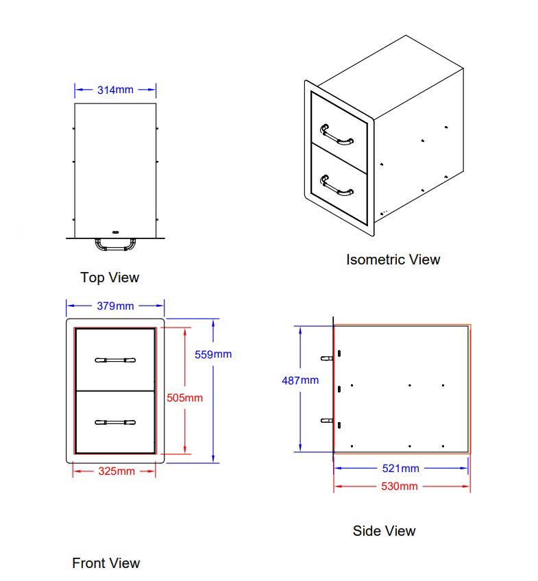 Crafted from high-quality 304 stainless steel, this double drawer unit features fully enclosed components for secure and easy storage. Measuring 325mm x 505mm, it offers a practical and durable solution for organizing essentials in your outdoor kitchen.