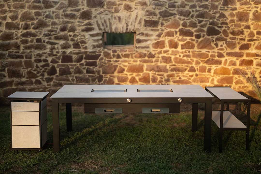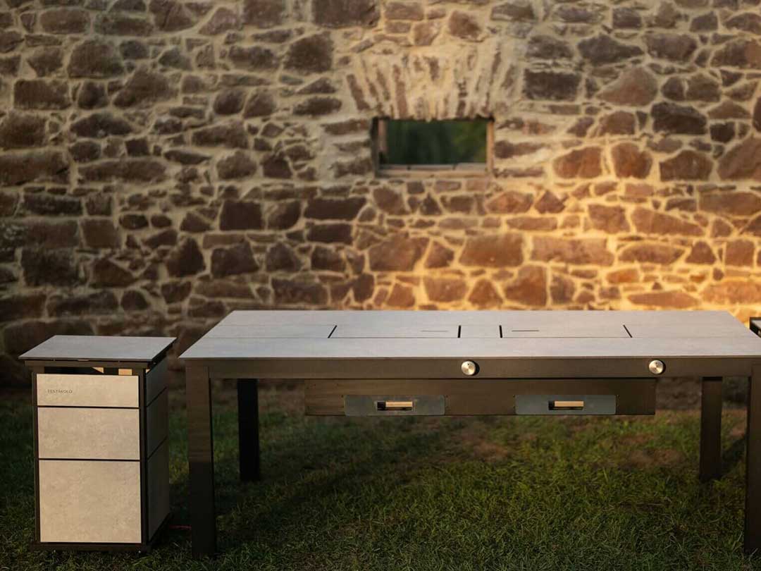 A FESTAVOLO FORTE MEDIO foi concebida para encontros maiores, combinando um elegante móvel para áreas exteriores com o potente desempenho de um grelhador numa peça central impressionante. Com capacidade para até 8 pessoas, esta mesa com churrasqueira transforma cada refeição numa experiência social partilhada, onde cozinhar e comer acontecem em conjunto.